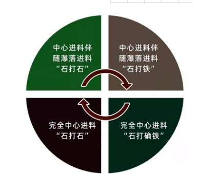 基本工作原理與中心進料伴隨瀑落料“石打鐵”相同,而進料方式為完全中心進料。
